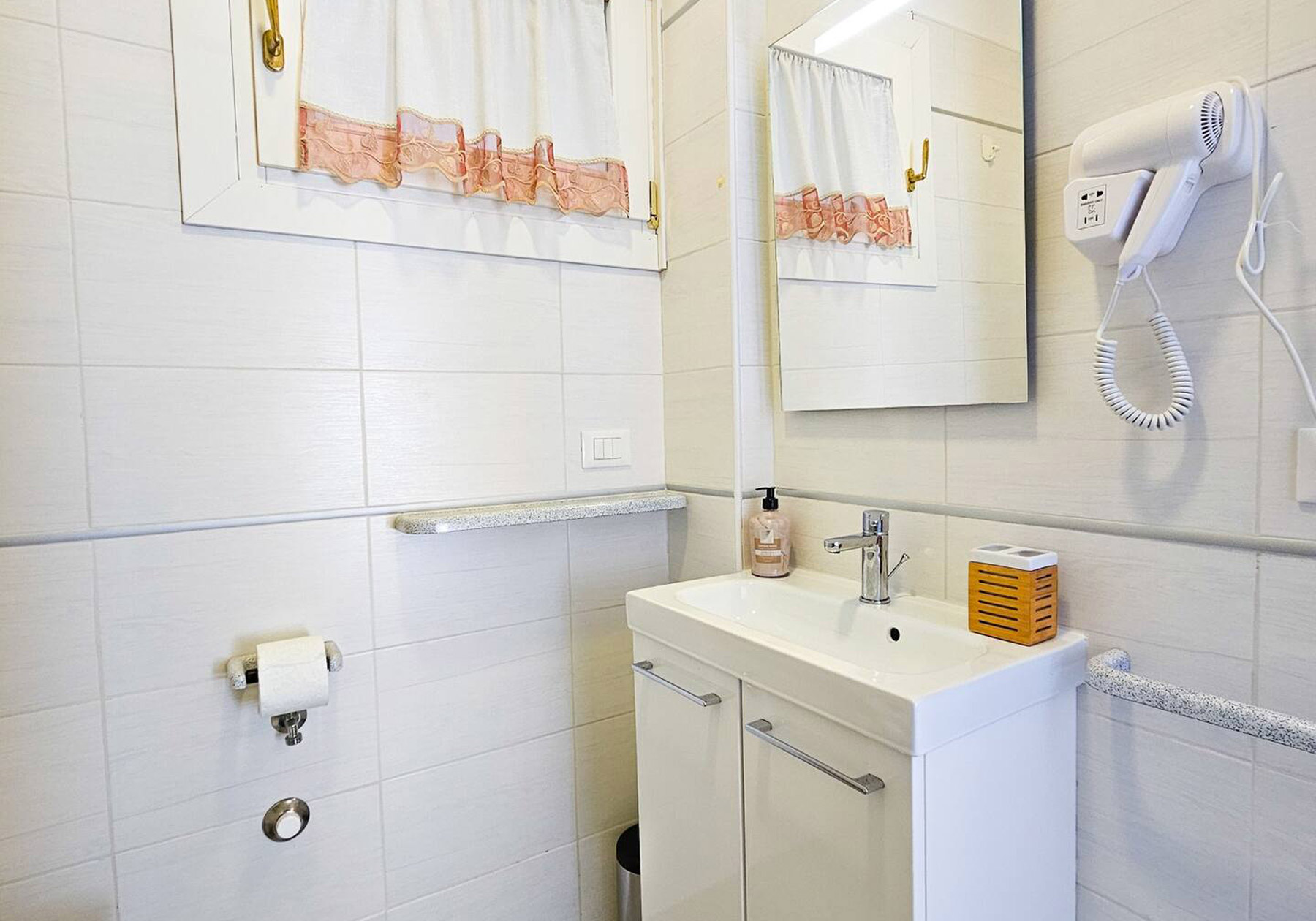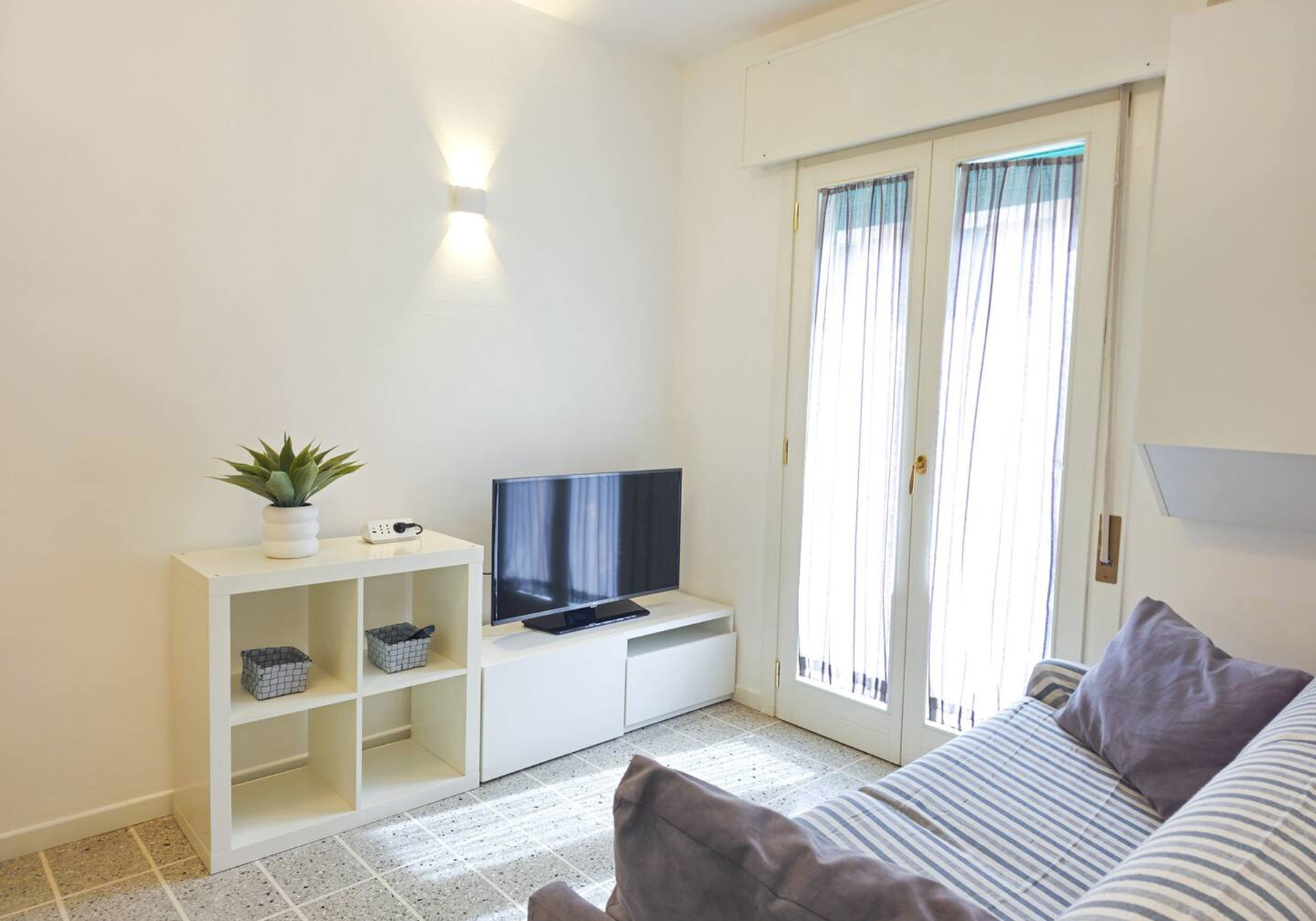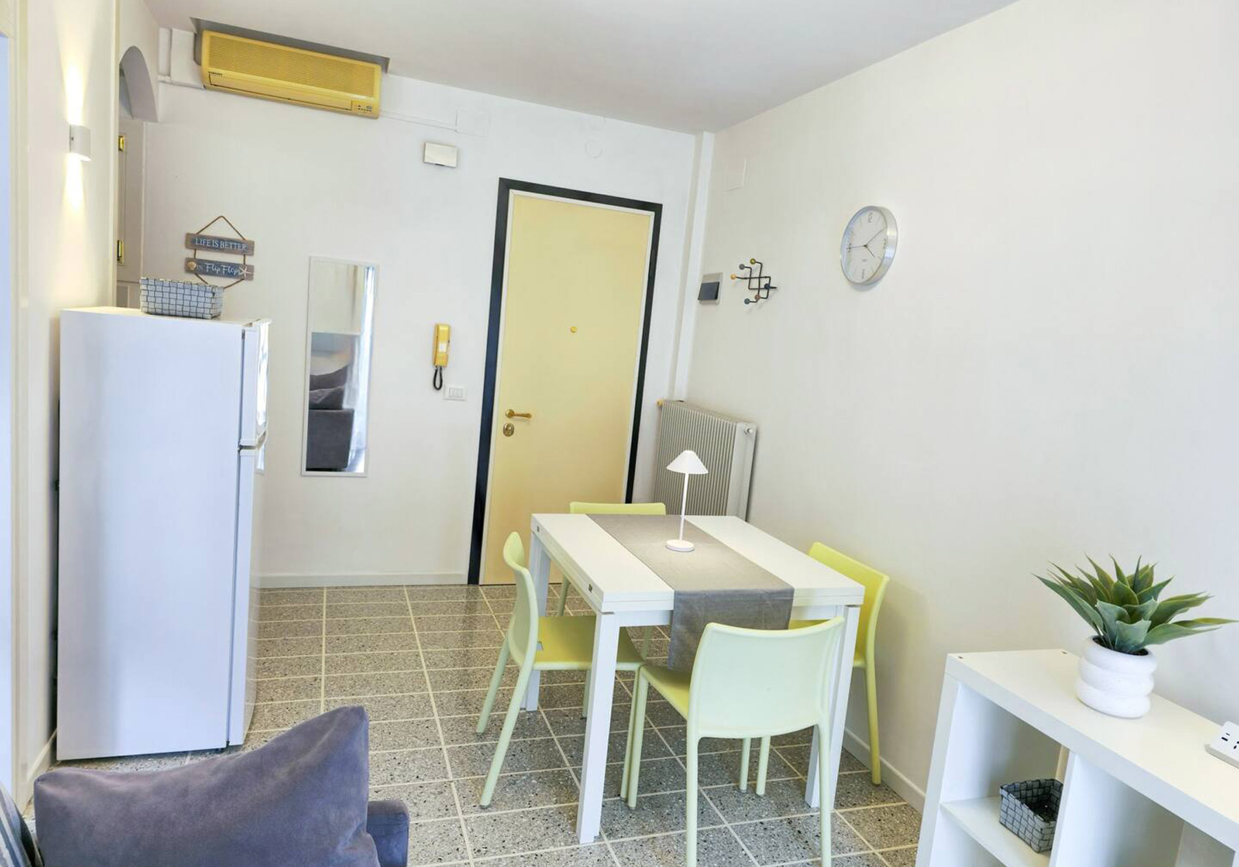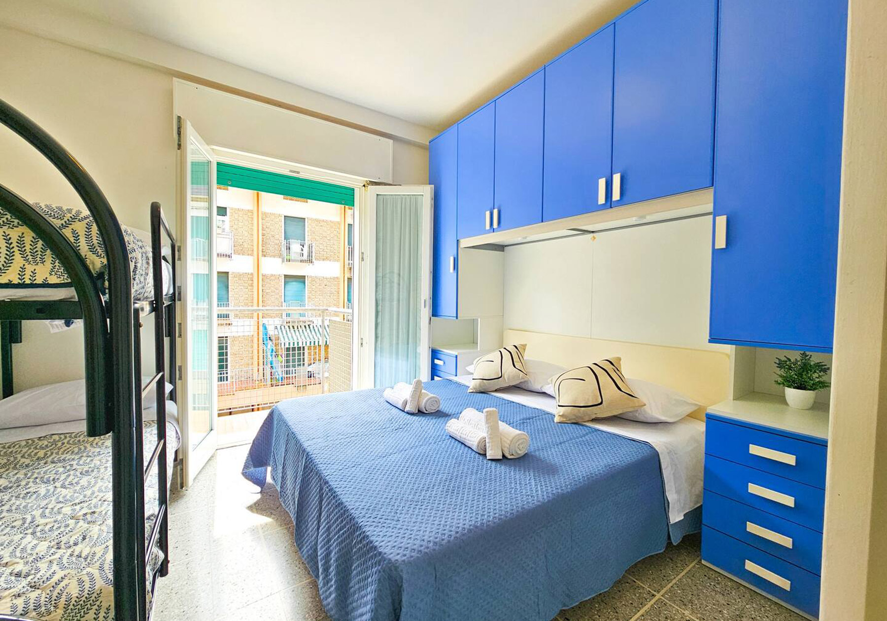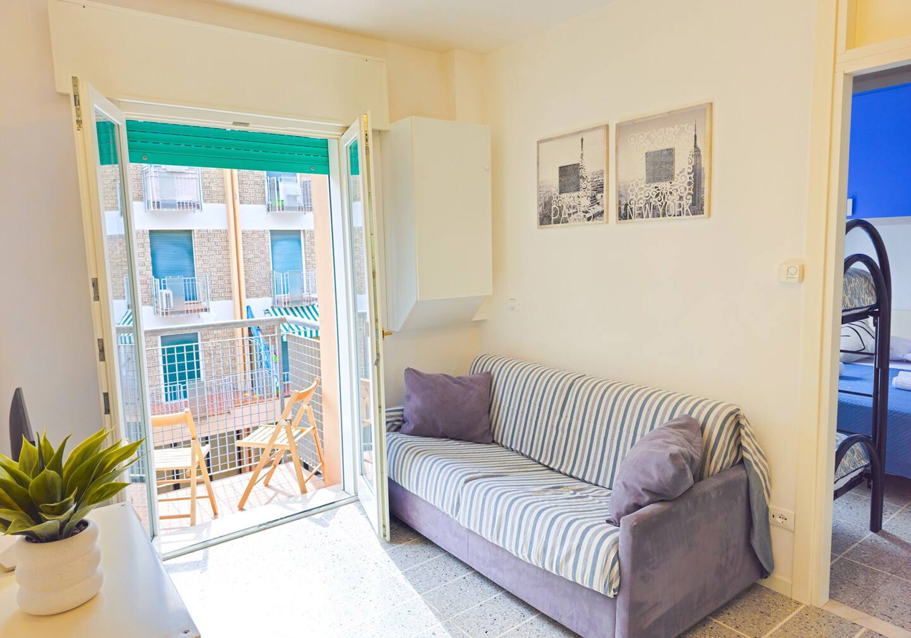 Großes Gebäude 80 Meter vom Meer entfernt in der zentralen Gegend der Piazza Mazzini in Lido di Jesolo. Die „Residence Augustus“ bietet eine Wohnung – NUR FÜR FAMILIEN – mit Sicherheitstür, TV und Klimaanlage. Unüberdachter Parkplatz auf dem Volta-Parkplatz in ca. 650 m Höhe. Ein Strandplatz ist nicht verfügbar