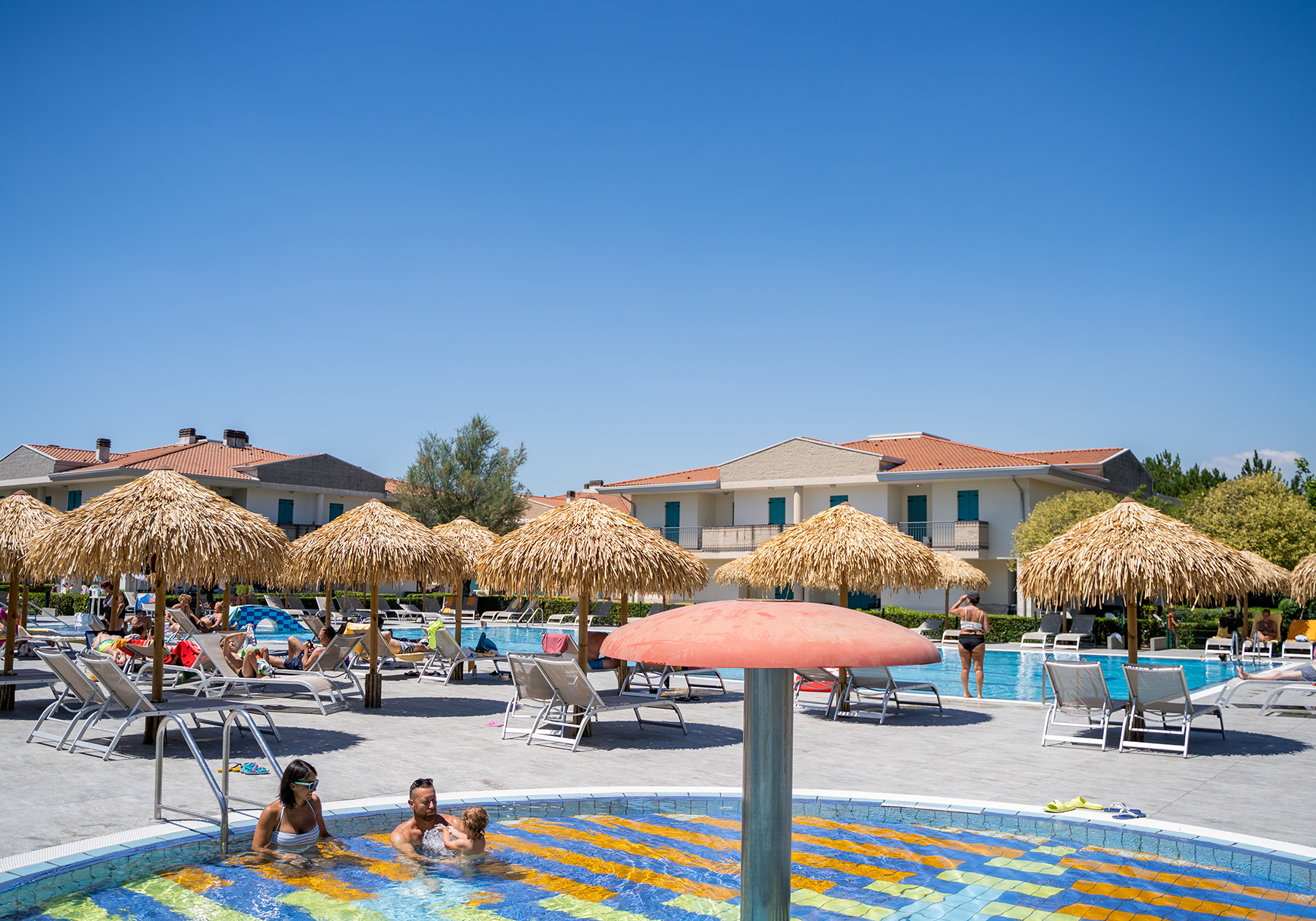 Der Pool für Erwachsene und Kinder verfügt über Wasserspiele, einen entspannenden Whirlpool und eine große Sonnenterrasse mit bequemen Liegen, Sonnenschirmen und Pavillons. Für Sportbegeisterte gibt es einen Fitnesspfad mit verschiedenen Geräten sowie Fitness- und Yogakurse für alle, die auch im Urlaub aktiv und fit bleiben möchten.