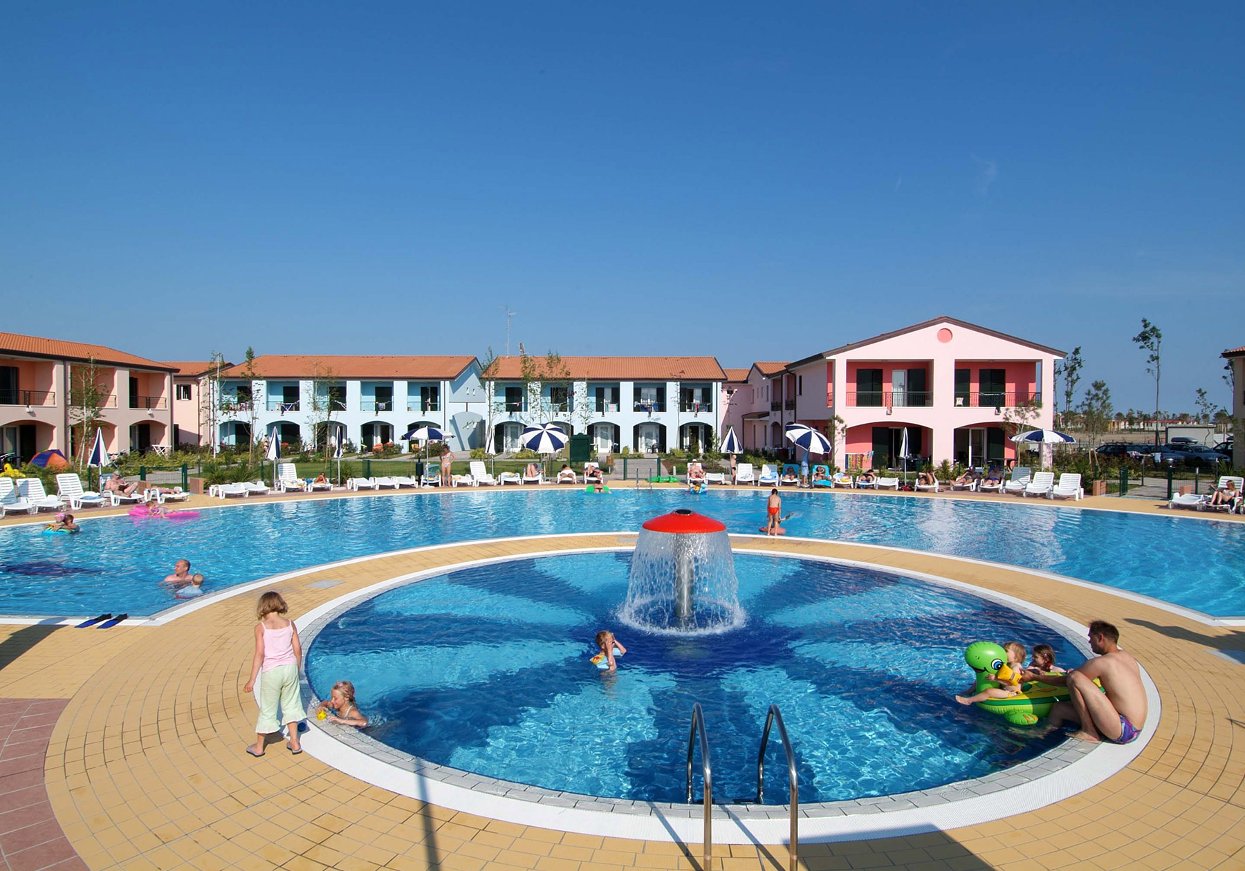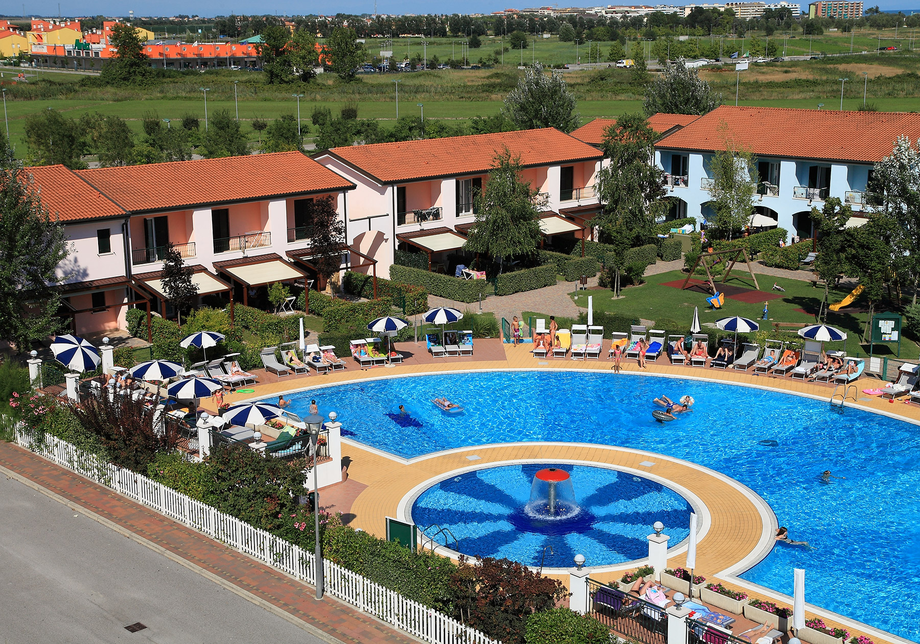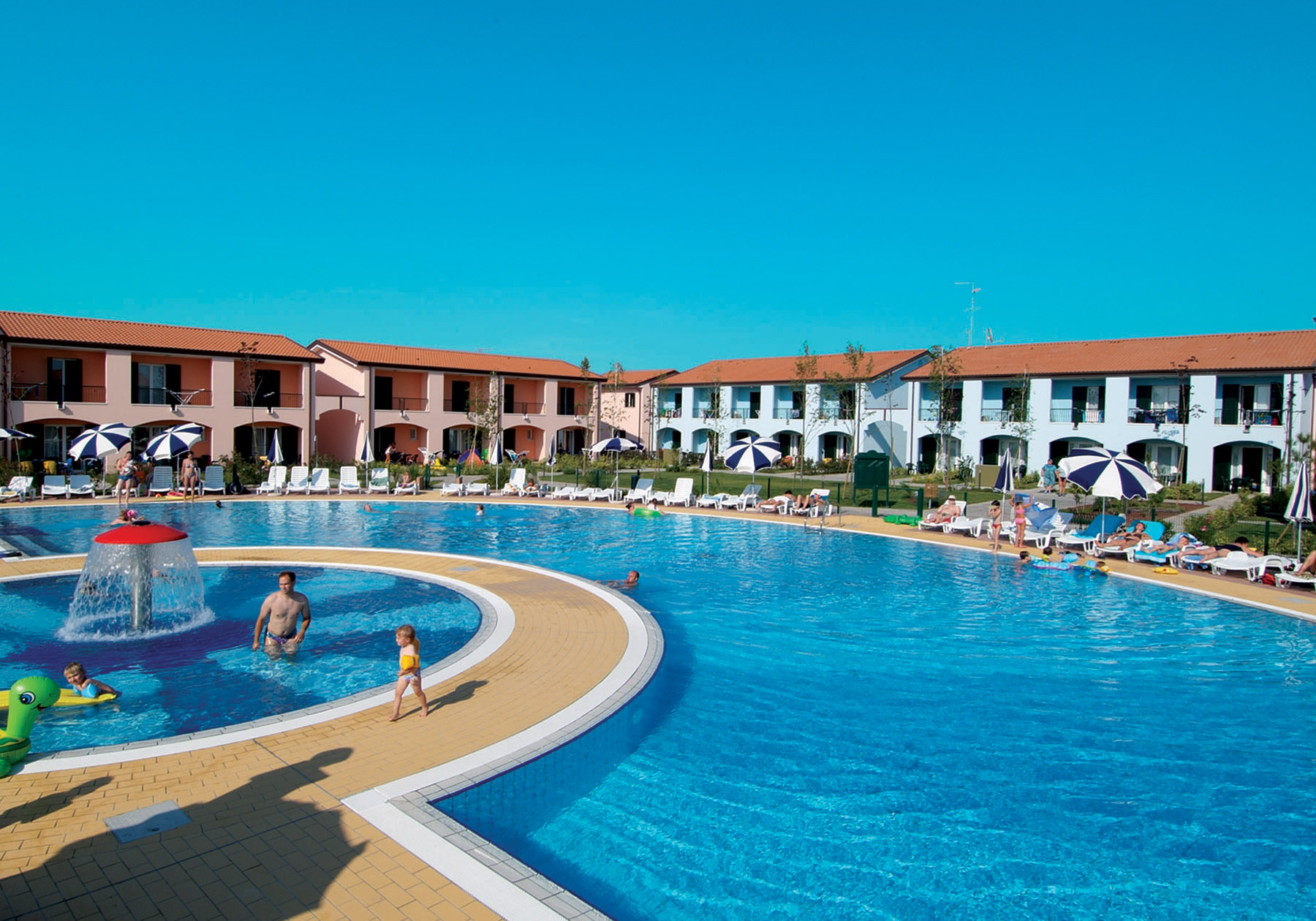 Eingebettet in viel Grün verfügt der Komplex über eine große zentrale Zone mit Schwimmbad für Erwachsene, Kinderbecken, Sonnenterrasse mit Liegen und Sonnenschirmen sowie einem Spielplatz für die kleinen Gäste.