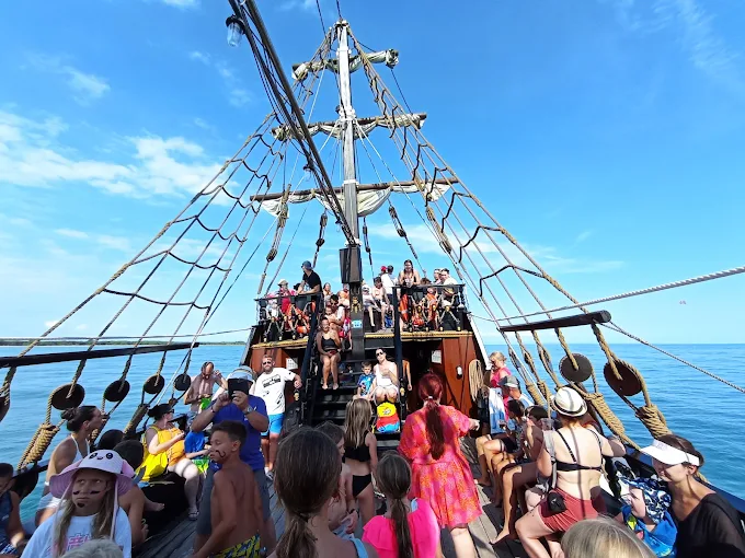 At Bibione, the ship departs three times a week: Monday, Wednesday, and Friday. The afternoon session at around 16:30 is particularly popular, as it lets families enjoy a full day on the beach before ending the day with the pirate show on board, sailing back close to sunset.