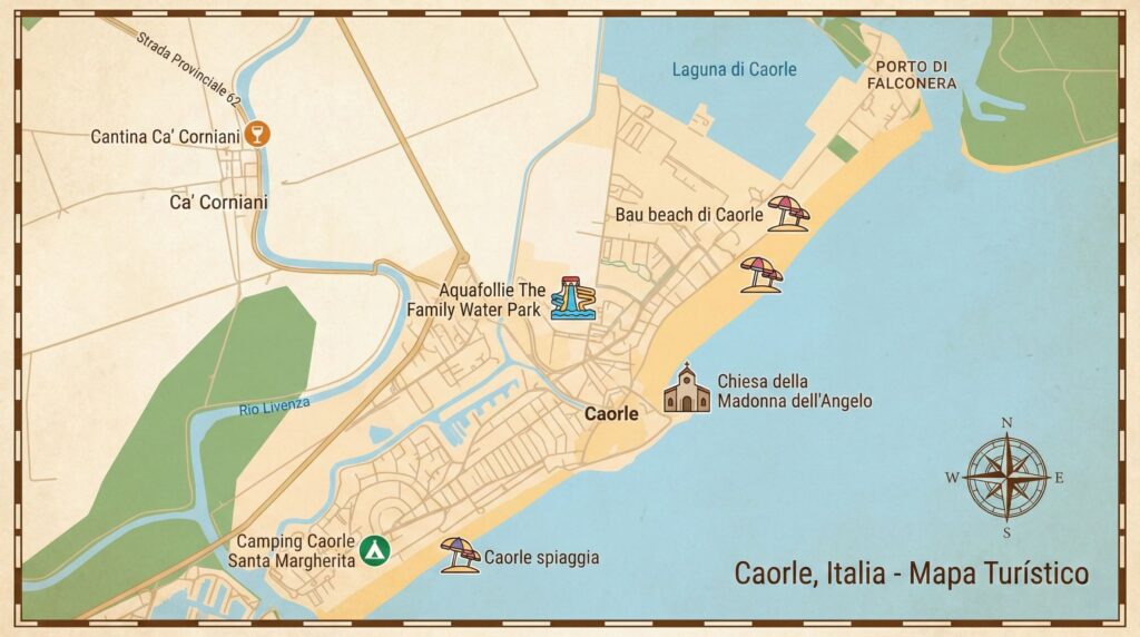 The town is flat, making the distance on the map very easy to translate into a walk or bike ride. Digital maps of Caorle often include layers for beach facilities, cycle paths, walking routes, and boat excursions into the lagoon.
