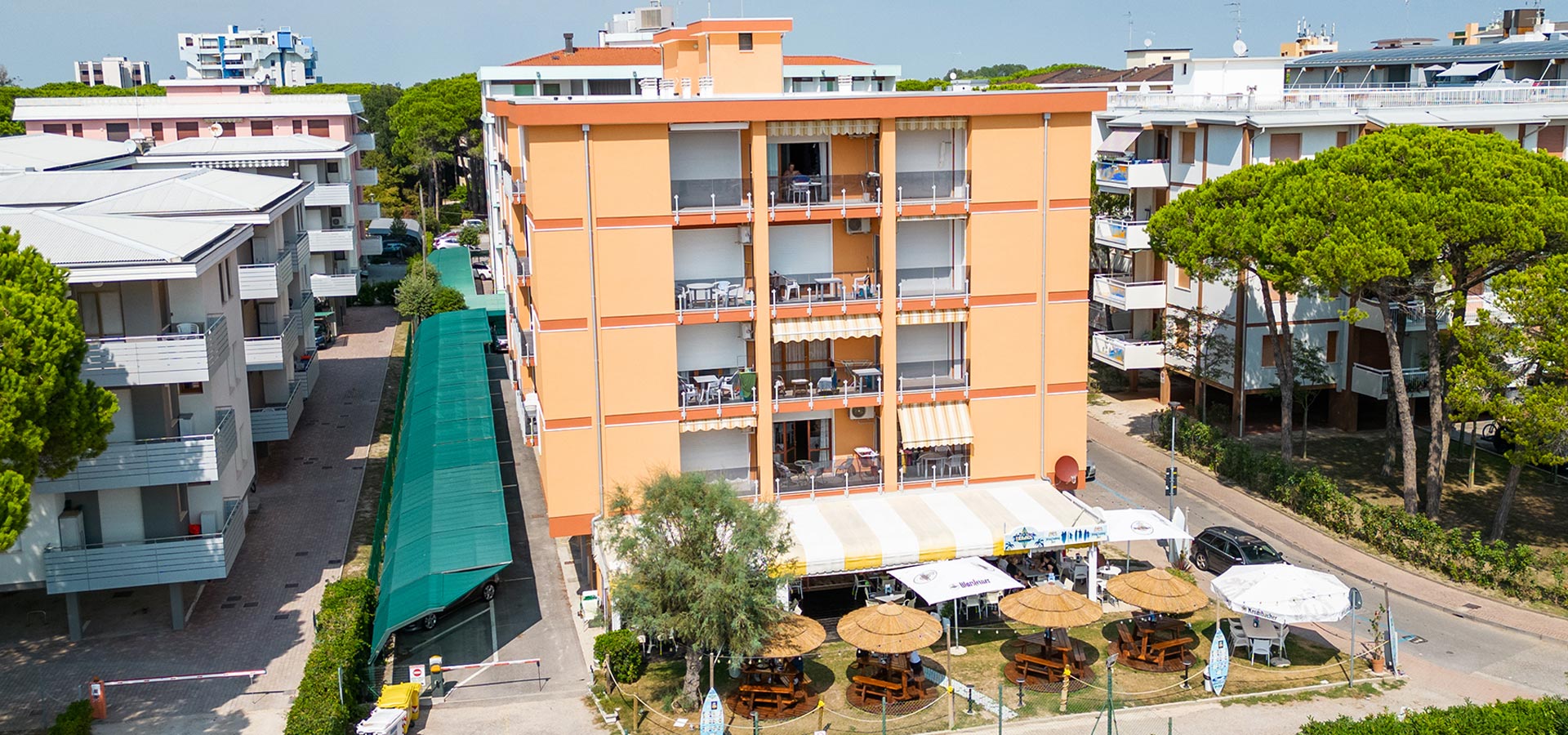 Tutti gli appartamenti dispongono di un posto auto numerato coperto. Al piano terra si trovano negozi, lavanderia a gettoni e bar con animazione serale. Davanti al condominio si trova campo da tennis a pagamento.