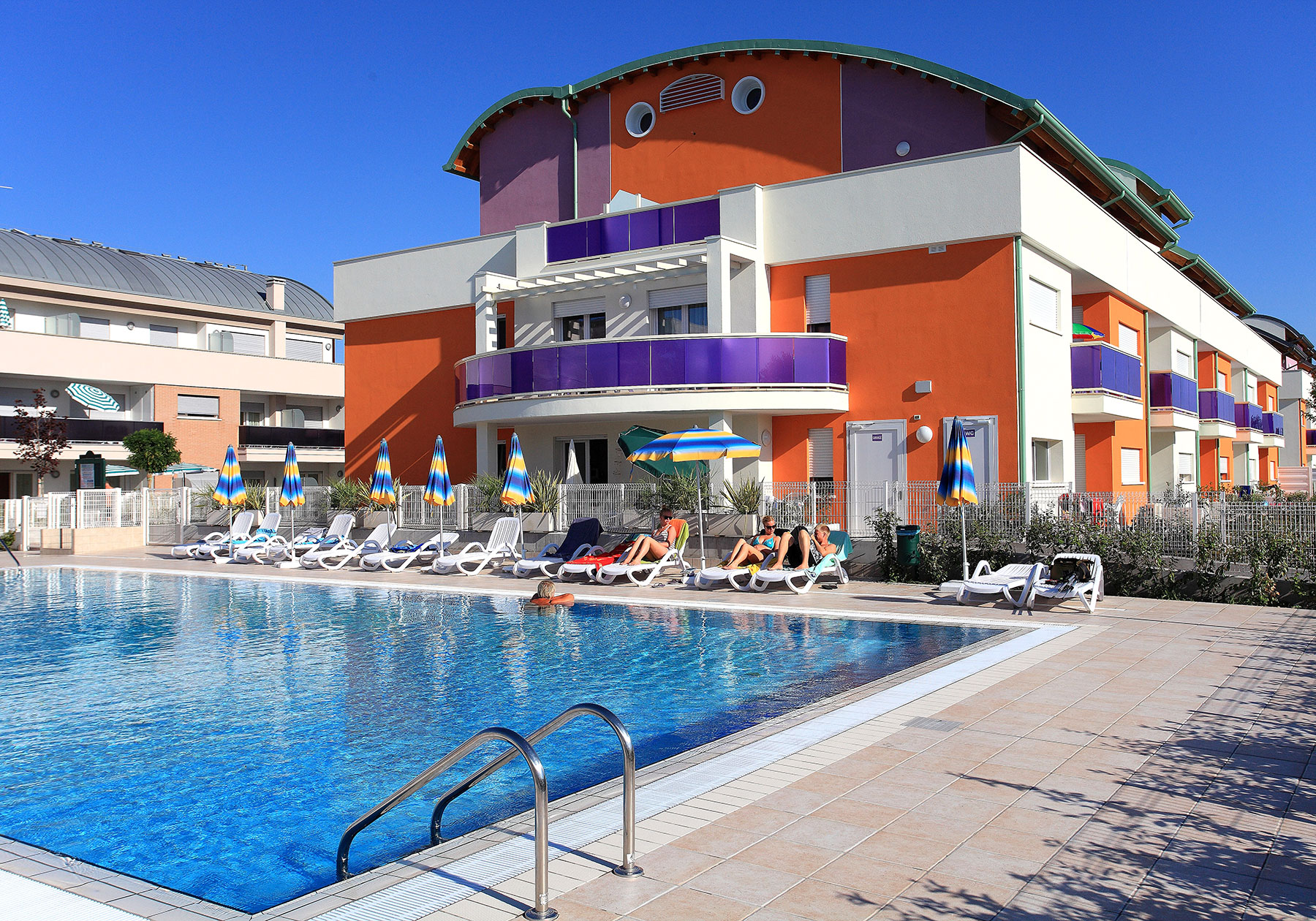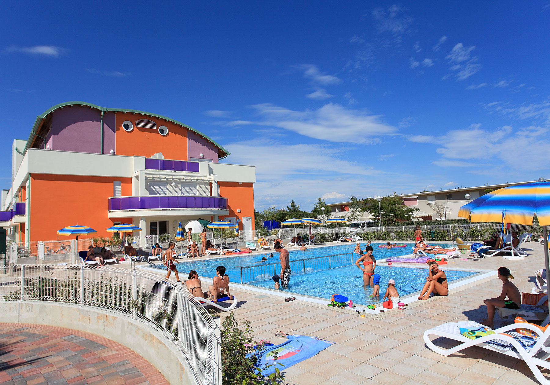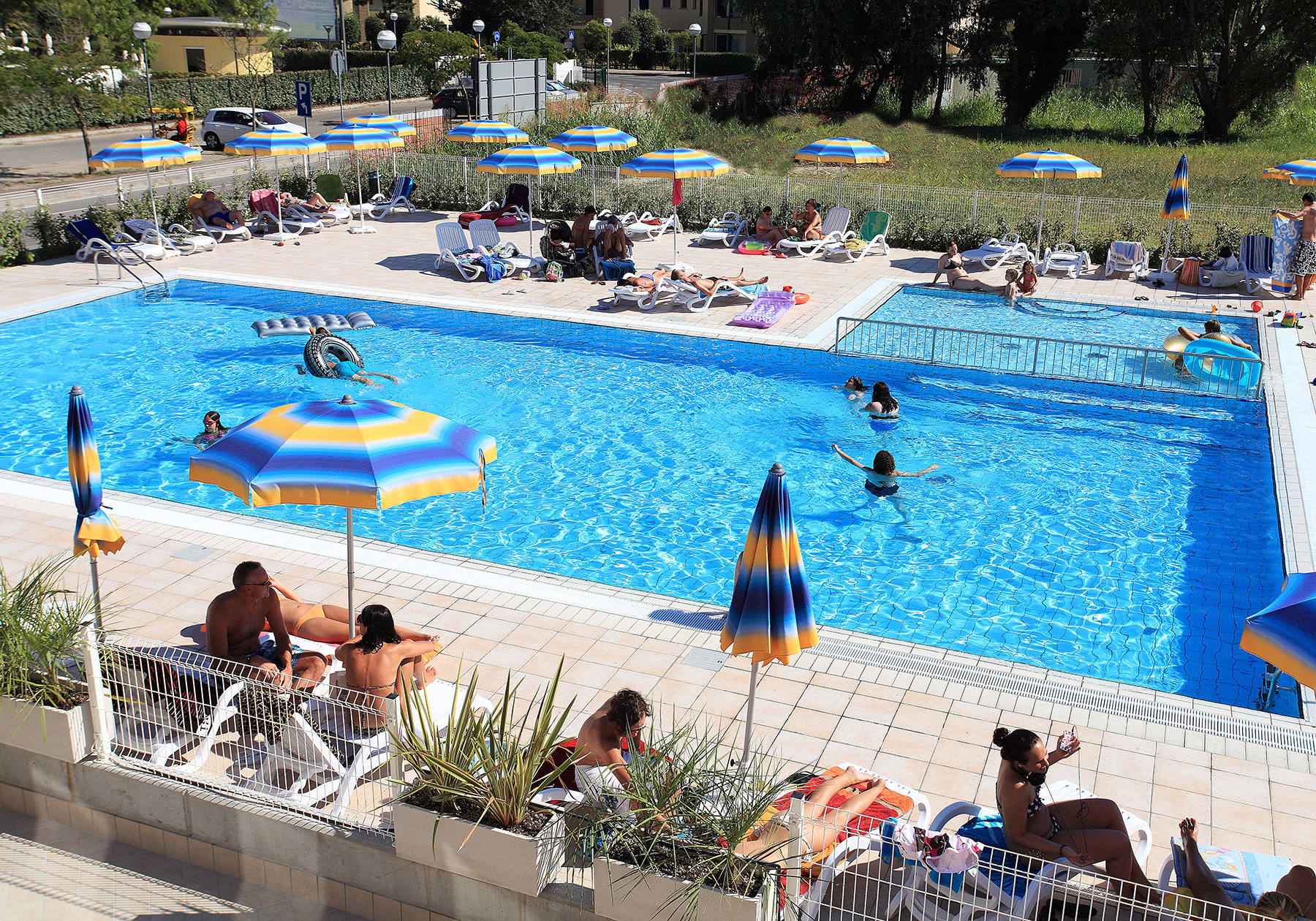 La struttura offre una grande piscina con area dedicata ad adulti e bambini, circondata da un ampio solarium con lettini e ombrelloni, ideale per rilassarsi al sole e godersi il ritmo lento delle giornate estive.